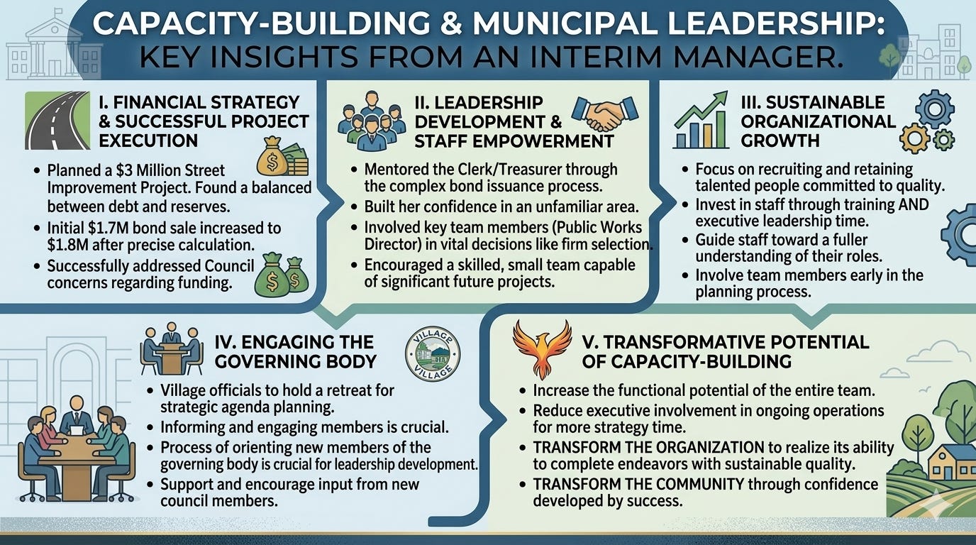 In a municipal organization, capacity-building must include informing and engaging members of the governing body. Village officials have committed to holding a retreat early in the tenure of the new manager to develop a strategic agenda. This is an important first step, one that needs to be continually reinforced by providing quality information about what the executive team is doing and why to accomplish the agenda. Although a municipal executive does not select those for whom he or she works, the process of orienting new members of the governing body is crucial to the development of their leadership potential.